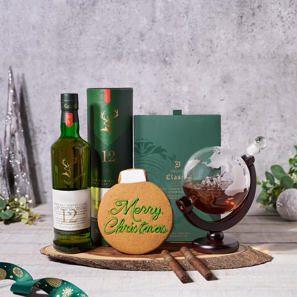 A wonderful gift idea for someone who appreciates quality, the Around the World Liquor Gift Basket from Hazelton’s features fine liquor, high-end snacks, and beautiful glassware, making it a great gift for a liquor aficionado. Included in this gift is a box of gourmet chocolate truffles, a Christmas cookie, two fragrant cigars, a bottle of whiskey, a glass globe decanter, and a live-edge serving board. You may also add on your choice of wine, beer, champagne, gourmet snacks, and more from our custom options. Give the gift of luxury with this great gift basket from Hazelton’s.