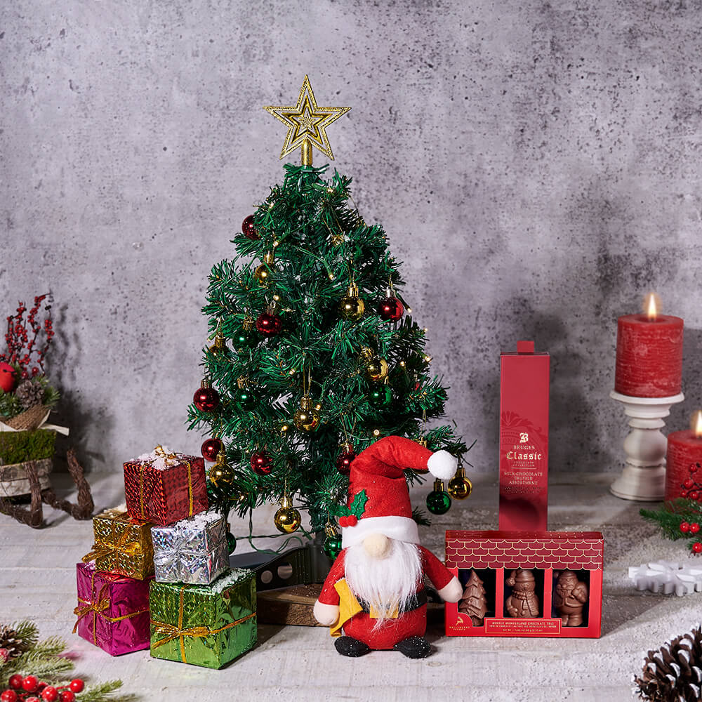 This gift set arrives professionally arranged with the decorative tree, plush Santa gnome, and chocolate selections thoughtfully placed in a board to create a festive holiday display. Each element is carefully positioned to ensure a polished and beautiful presentation upon arrival.
